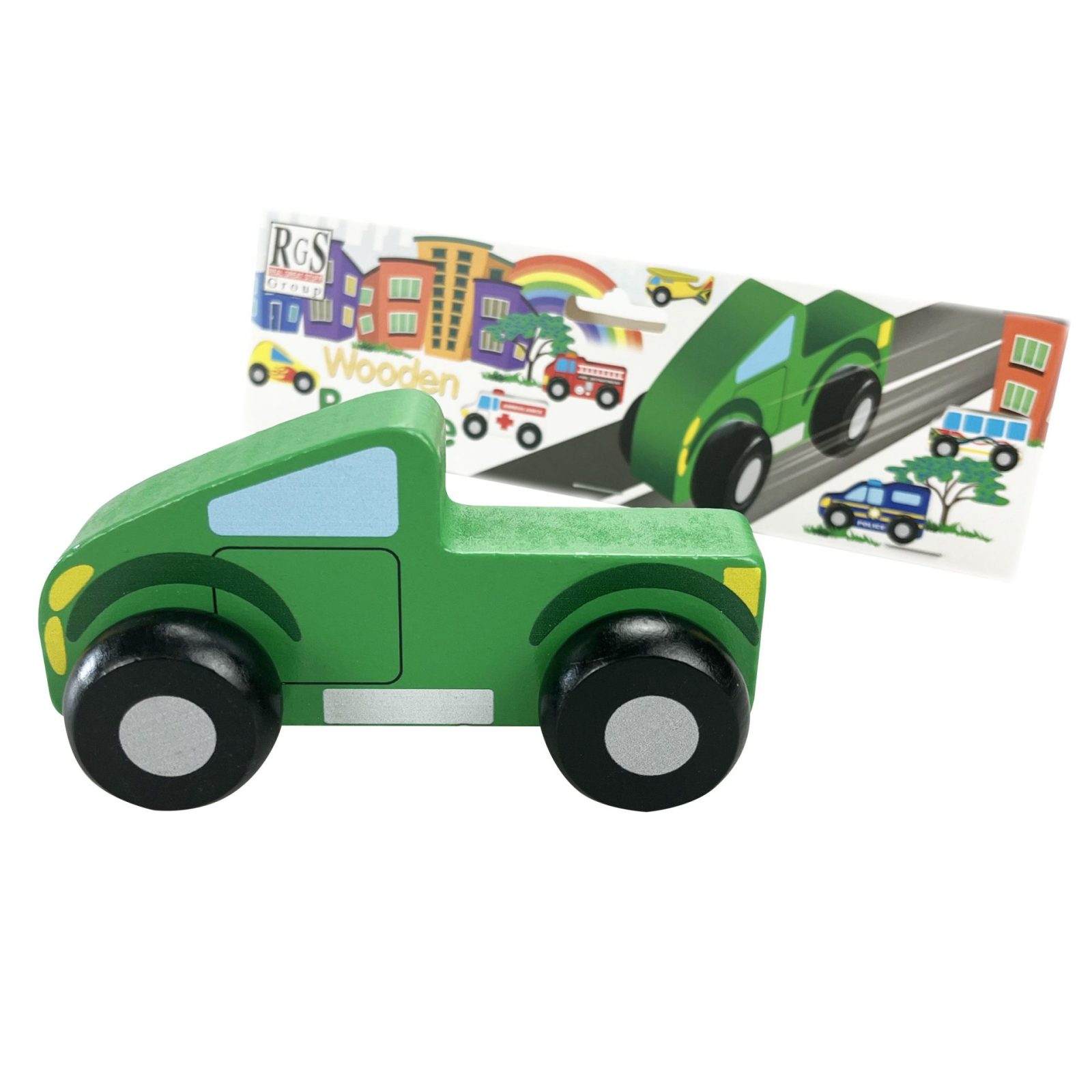 Each vehicle is quality crafted from wood, is hand-painted and contains moving wheels.