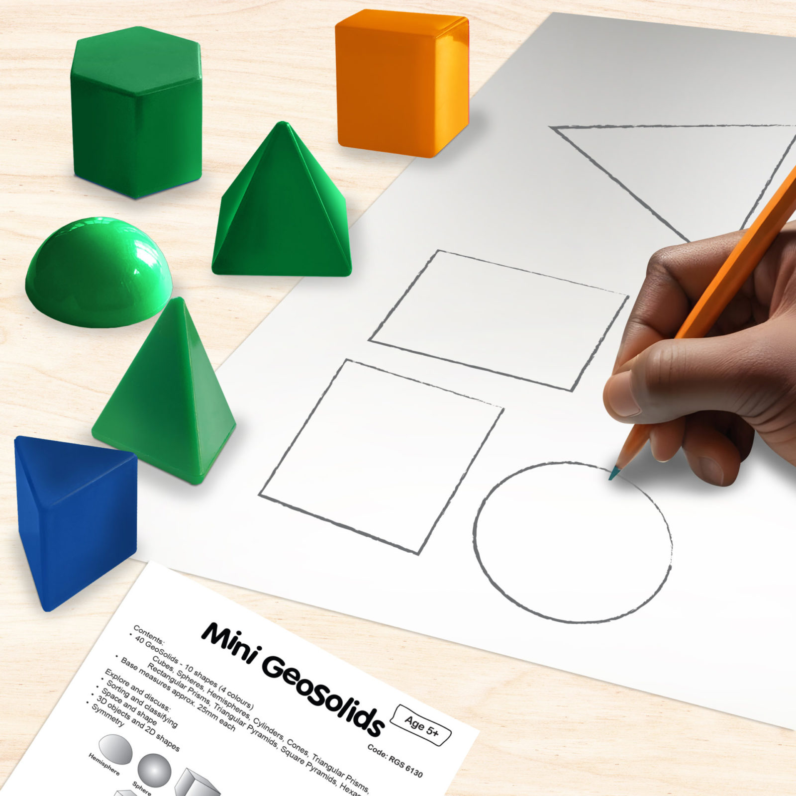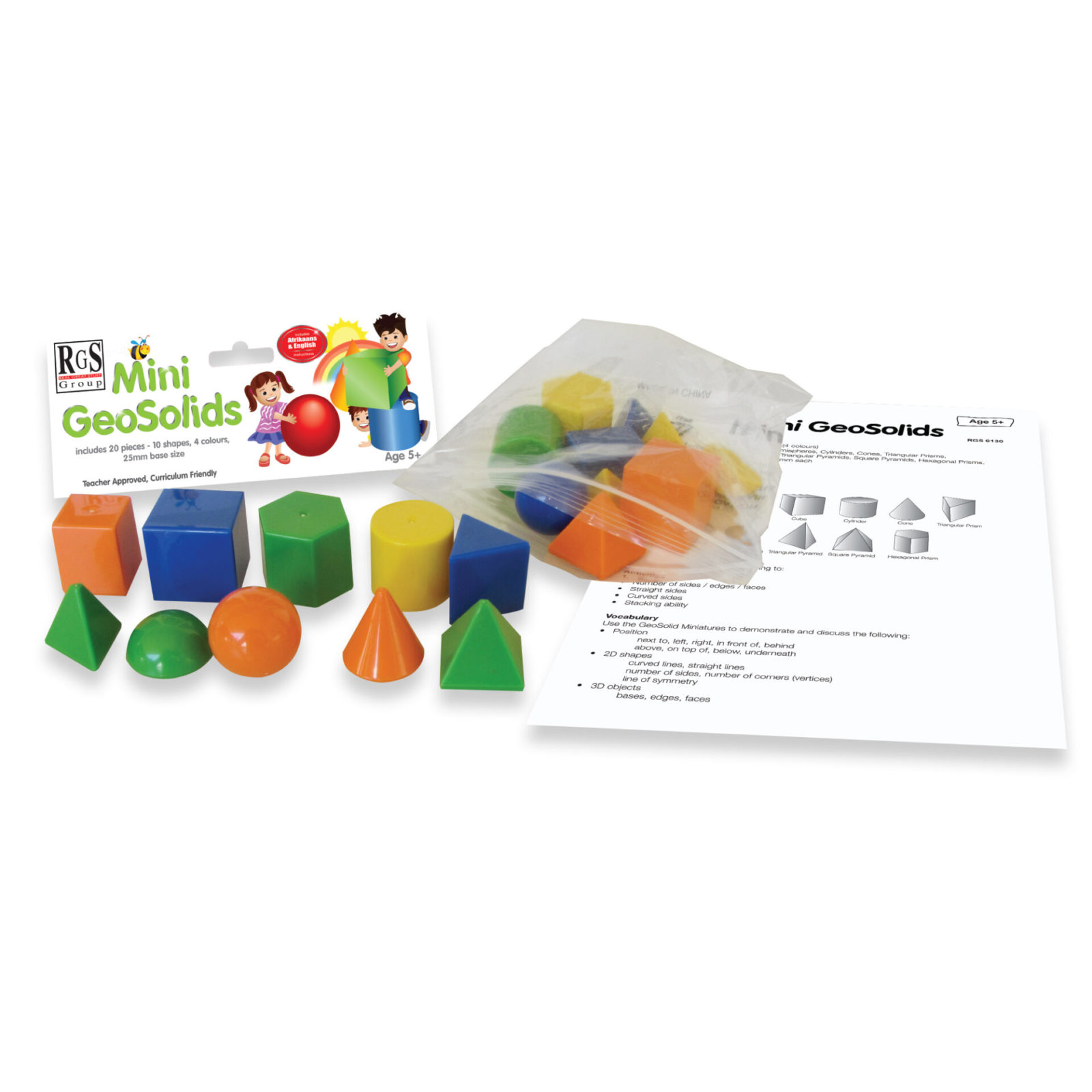 Our packs of miniature plastic Geometric Solids features 10 shapes, 4 colours and bases approx. 25mm.