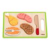 • Wooden cutting board, knife, steak, fish, chicken, and sausage pieces