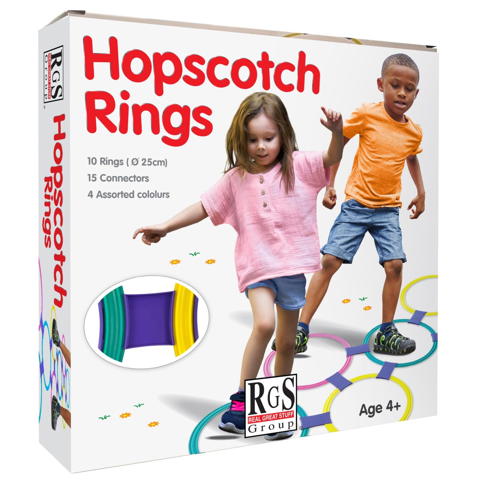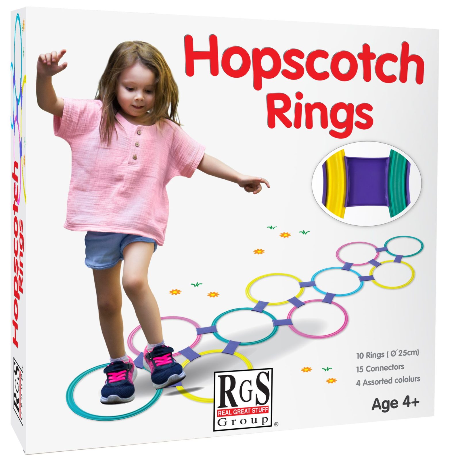Hopscotch Rings Play Set is a fun new twist on a classic playground game. Enjoy a fun hopscotch game, indoors and outdoors.