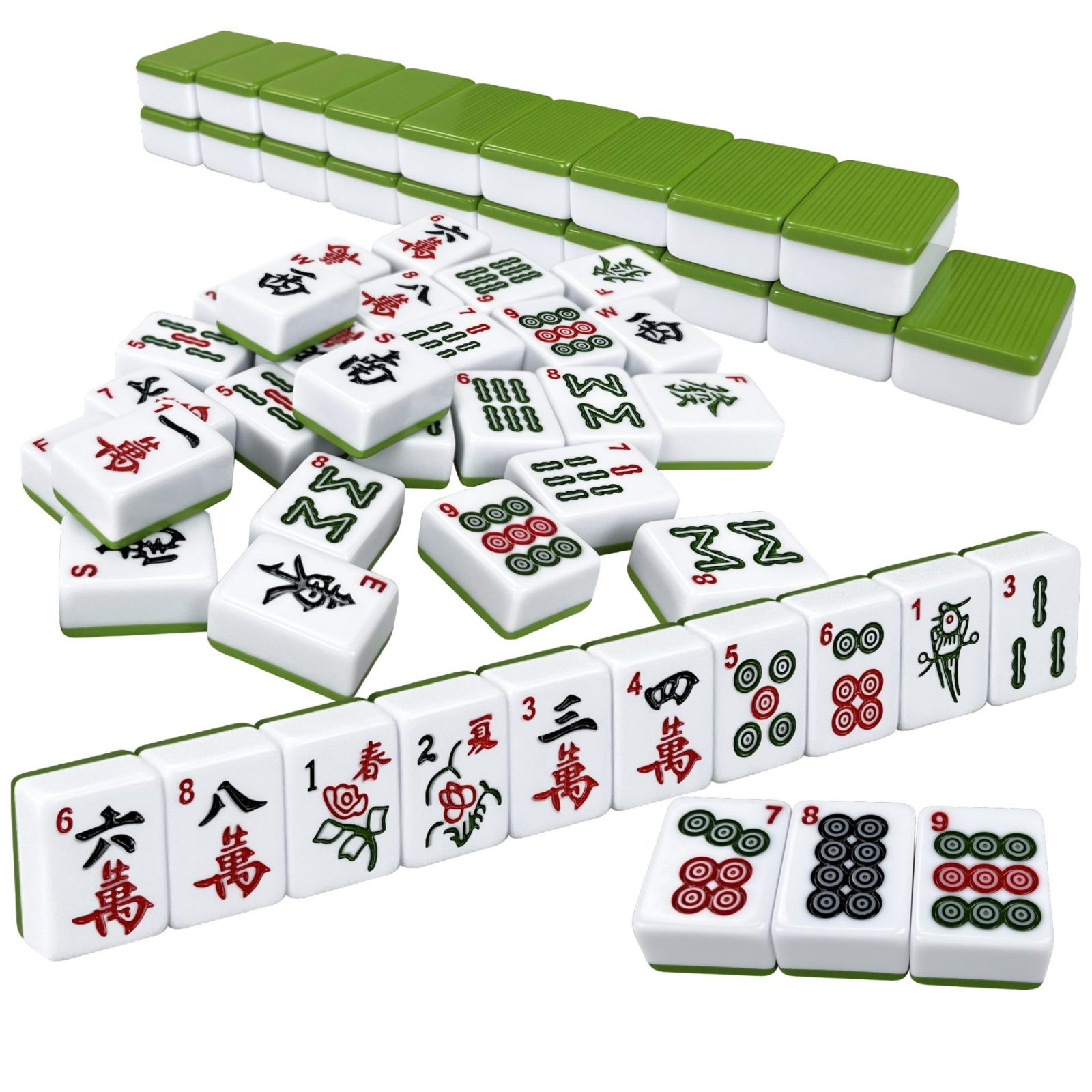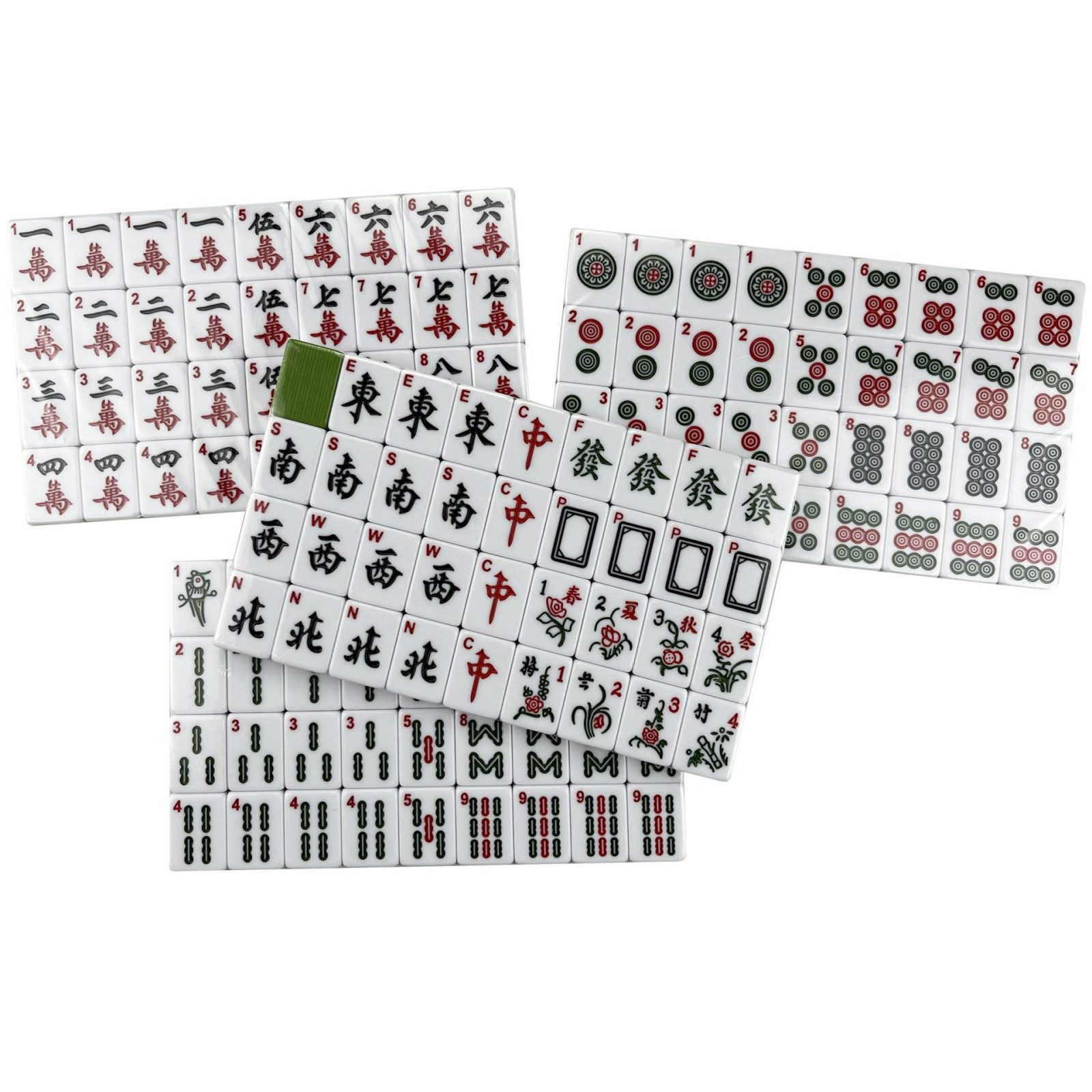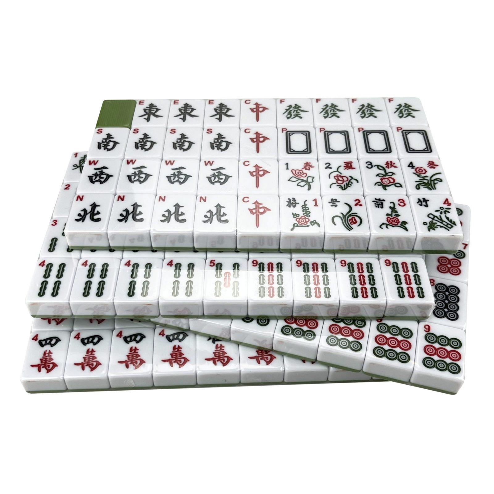 • Comprehensive set includes 36 characters, 36 bamboos, 36 circles, 16 wind tiles, 12 dragon tiles, 4 flowers tiles, and 4 seasons tiles